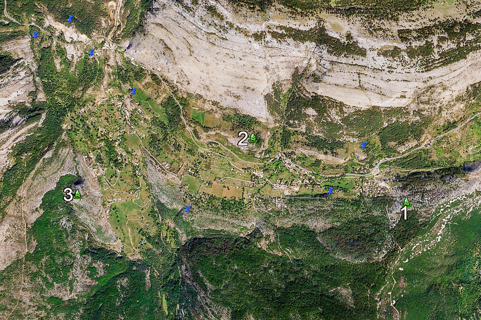 Emplacement de ces trois structures. Les épingles bleues situent les autres enceintes proches: